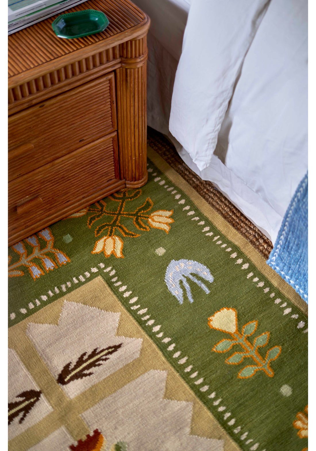 On horizontal looms, artisans pass the weft yarns carefully through the warp, beating them tightly into place to form a strong, flat surface to create a tactile, versatile flatweave.