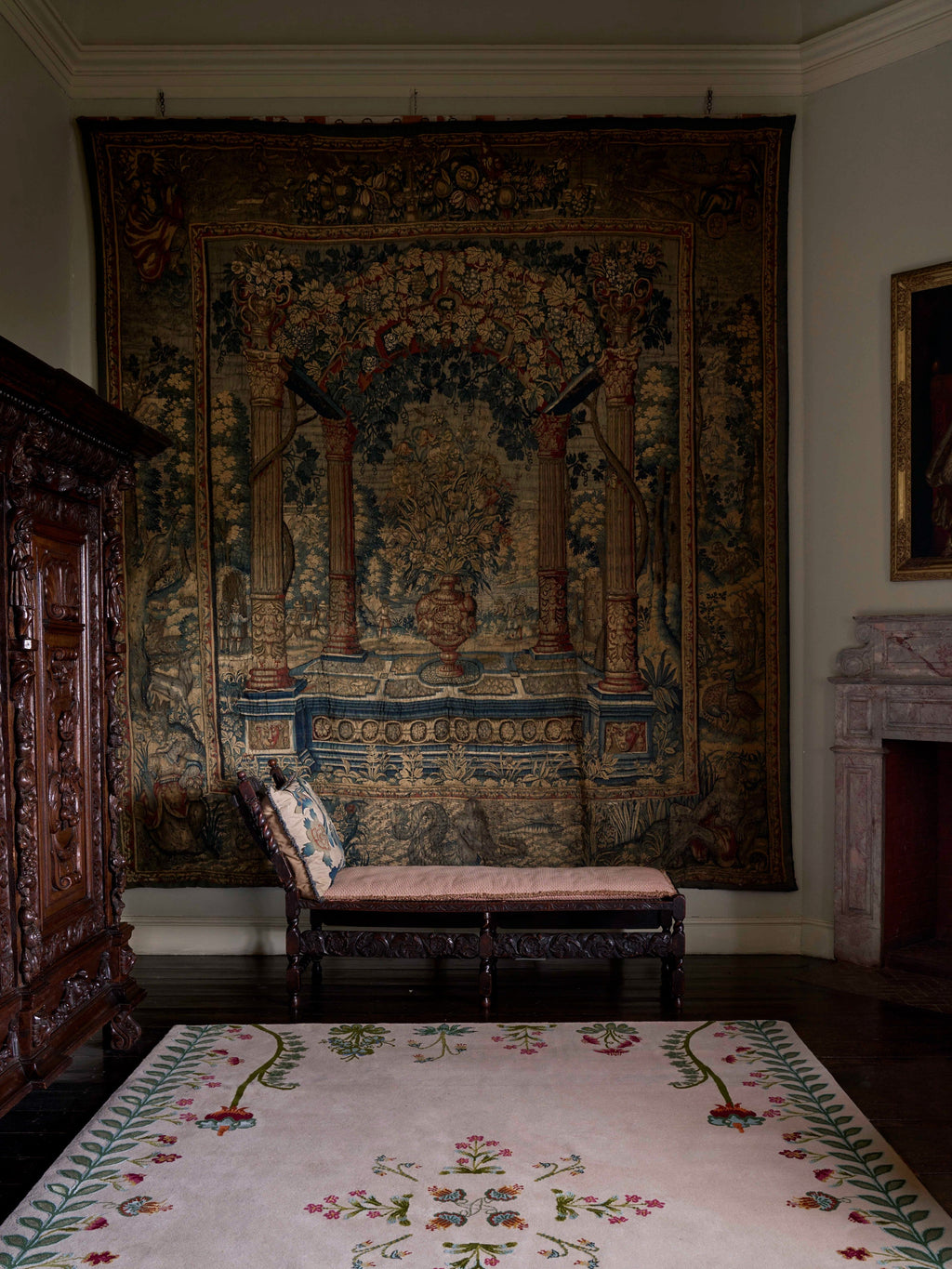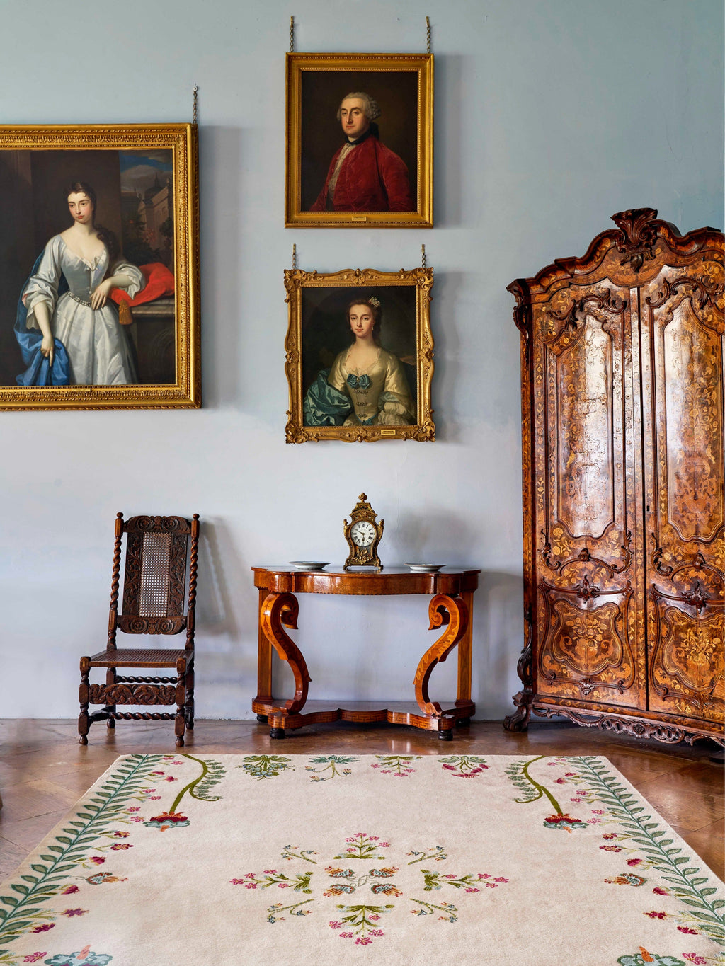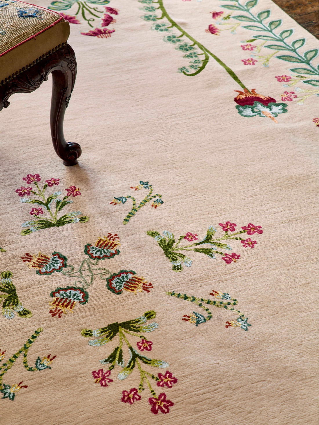 The design reflects the mutual appreciation for nature, mysticism, and craftsmanship. The rug's intricate floral patterns, created from entirely unique imagined blooms, evoke the magic of medieval gardens. Drawing colour inspiration from medieval tapestries and stained glass, the Flower Compass features a bold palette of reds, greens, blues, and golden yellows. These hues are derived from historical dyeing methods, such as turmeric and saffron for yellow, malachite for green, and azure for blue, giving the rug an authentic connection to its medieval roots.