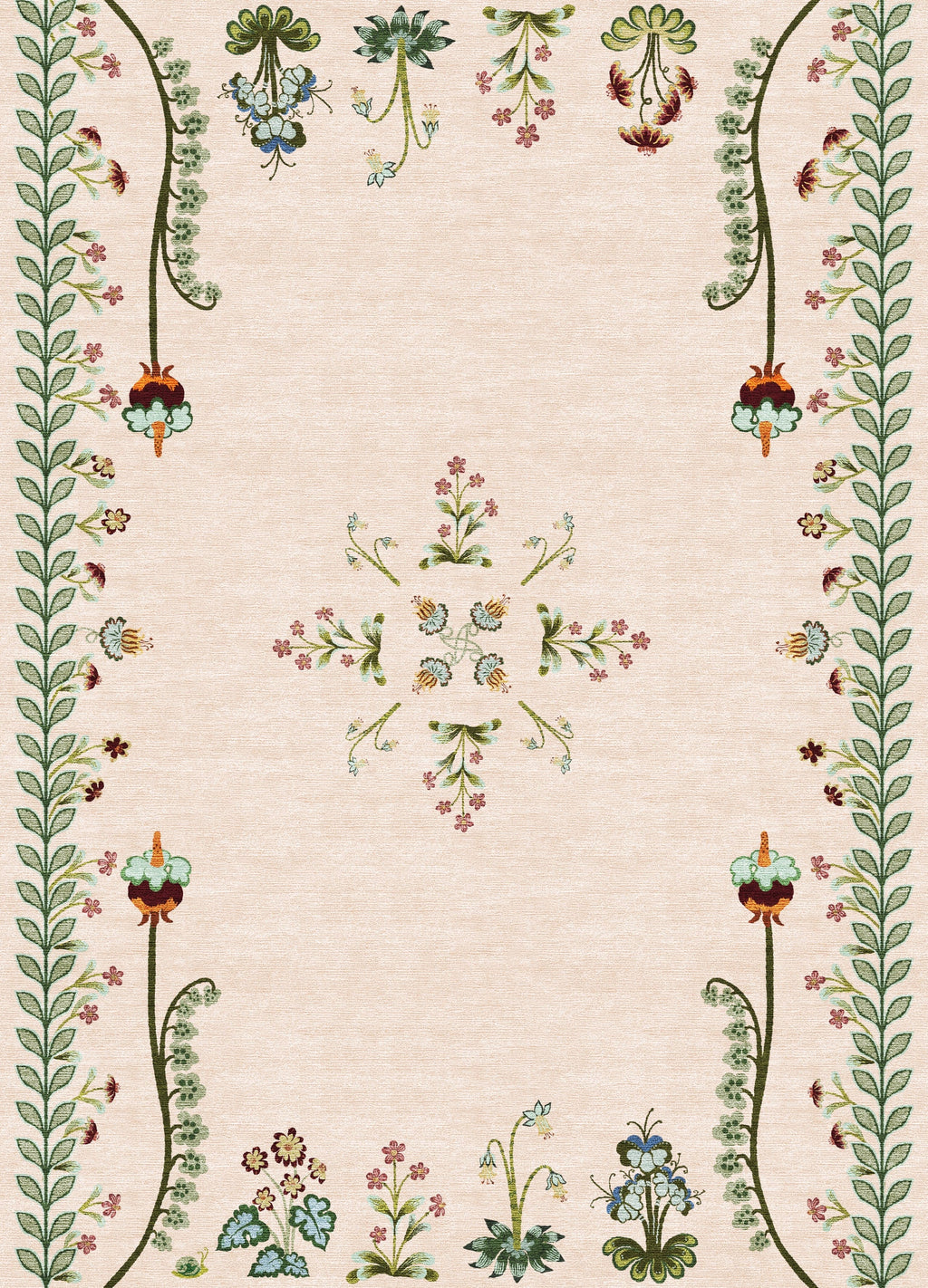 Inspired by medieval mythology and symbolism, the Flower Compass rug draws from motifs such as the Compass Rose, representing spiritual direction and discovery, and the snail, symbolising personal strength and resilience. The circular design, reminiscent of medieval wreaths and garlands, suggests movement and adaptability.