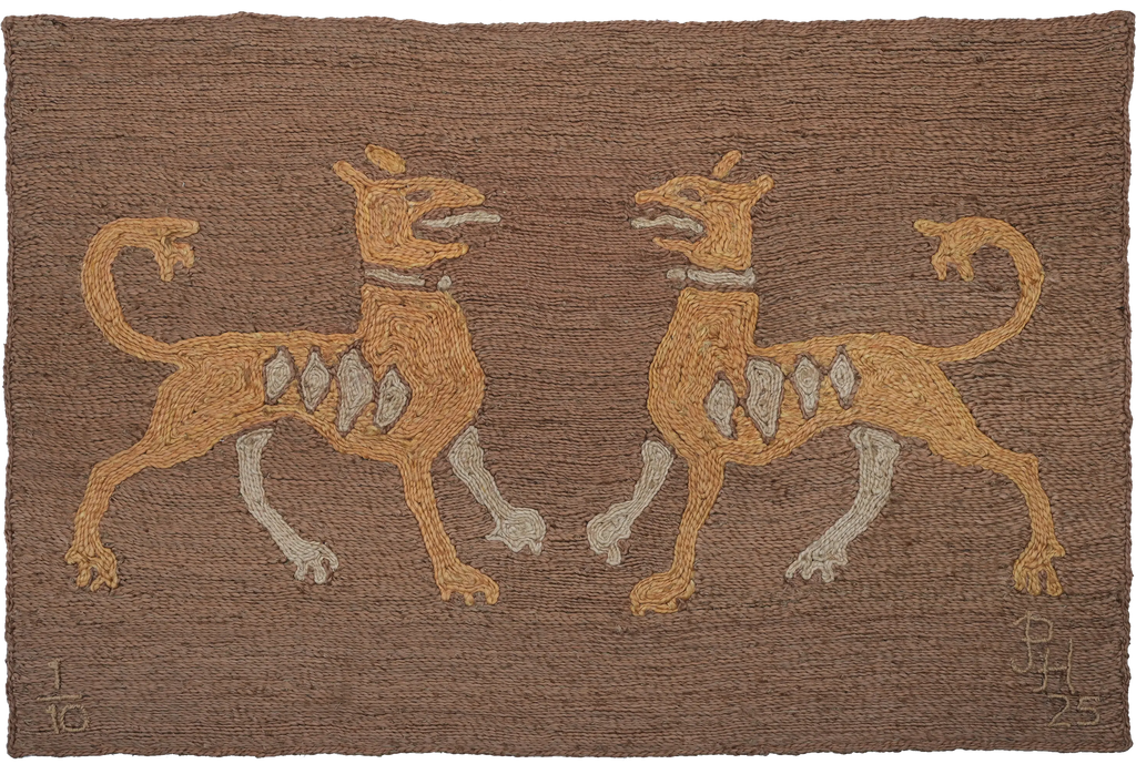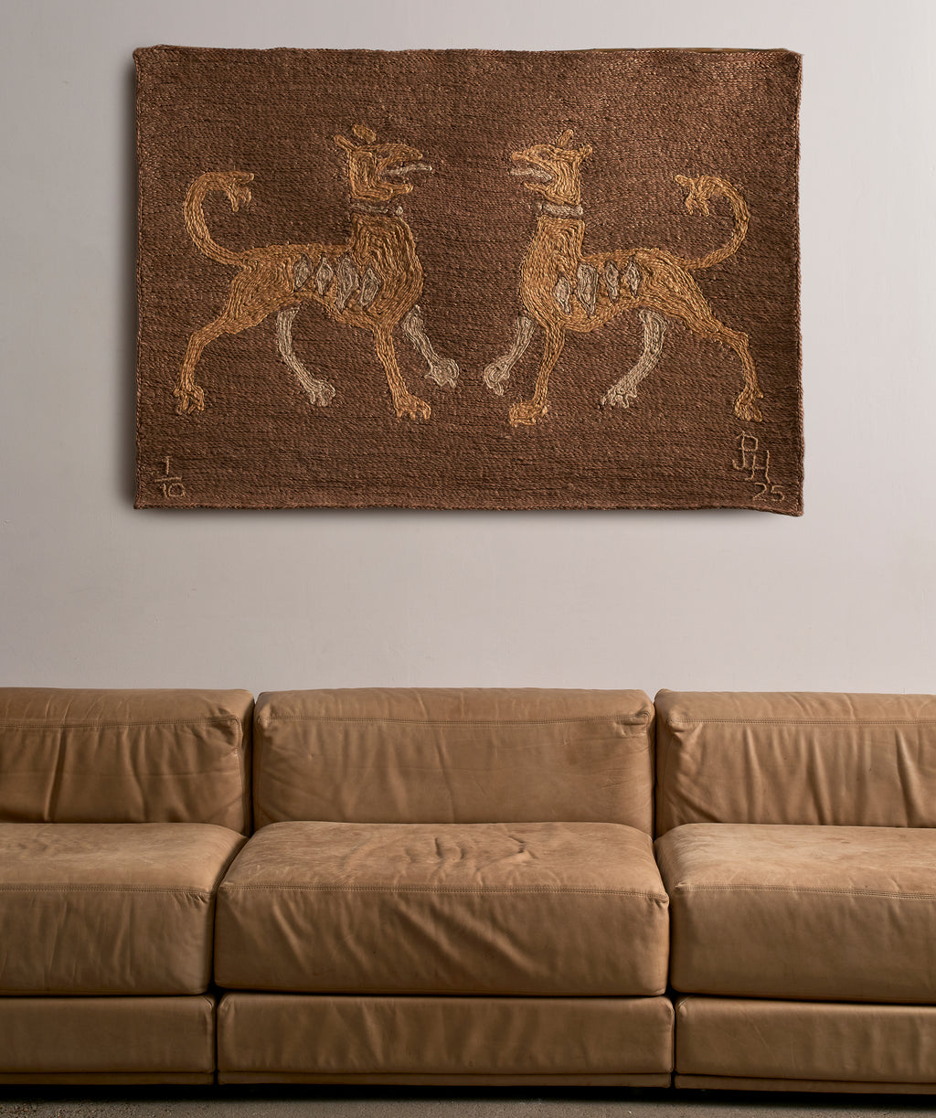 A new edition to our Woven Art Collection, Hound design takes inspiration from medieval tapestries celebrating companionship, loyalty, and heraldic symbolism. The two hounds depicted in the Hound Design face one another in a poised dialogue, evoking the noble spirit and enduring bond between humans and their earliest animal allies.