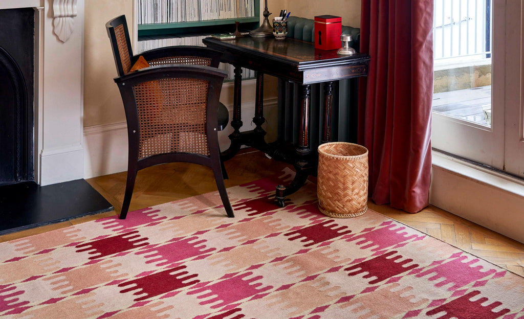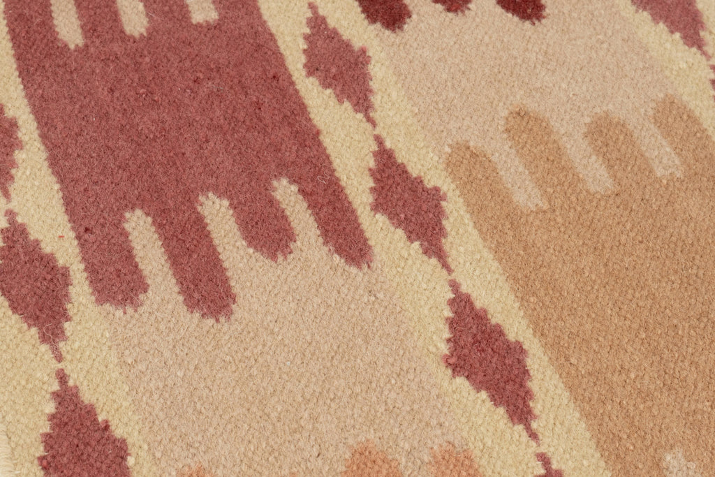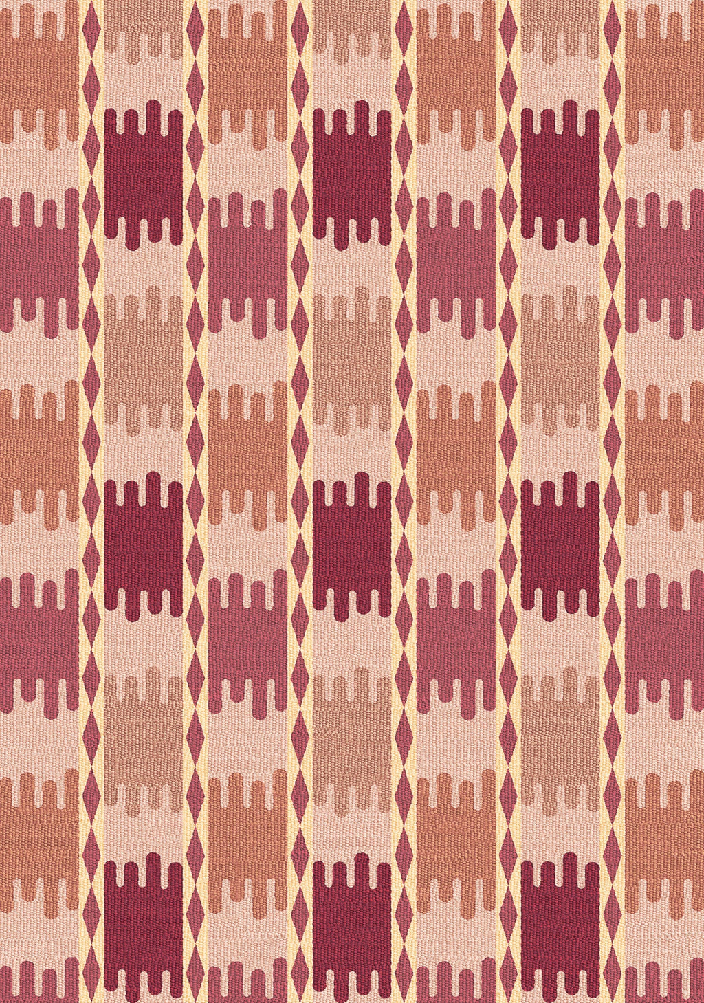 With an interplay of brick, pink, and orange tones, Kimono's intricate design of interconnected Katachi is ordered by striking, diamond-laddered columns, evoking the warmth and fluidity of antique Japanese textiles.