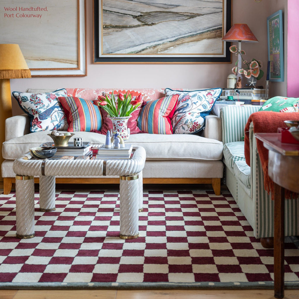 The Chequerboard rug has quickly become a recognisable design by Barlow & Barlow for Kin House. A classic chequerboard with a contemporary twist. A border of dots and dashes combined with a selection of 6 timeless colourways, handpicked by Lucy. The impactful and uplifting design confidently embraces colour, and will instantly transform any interior.