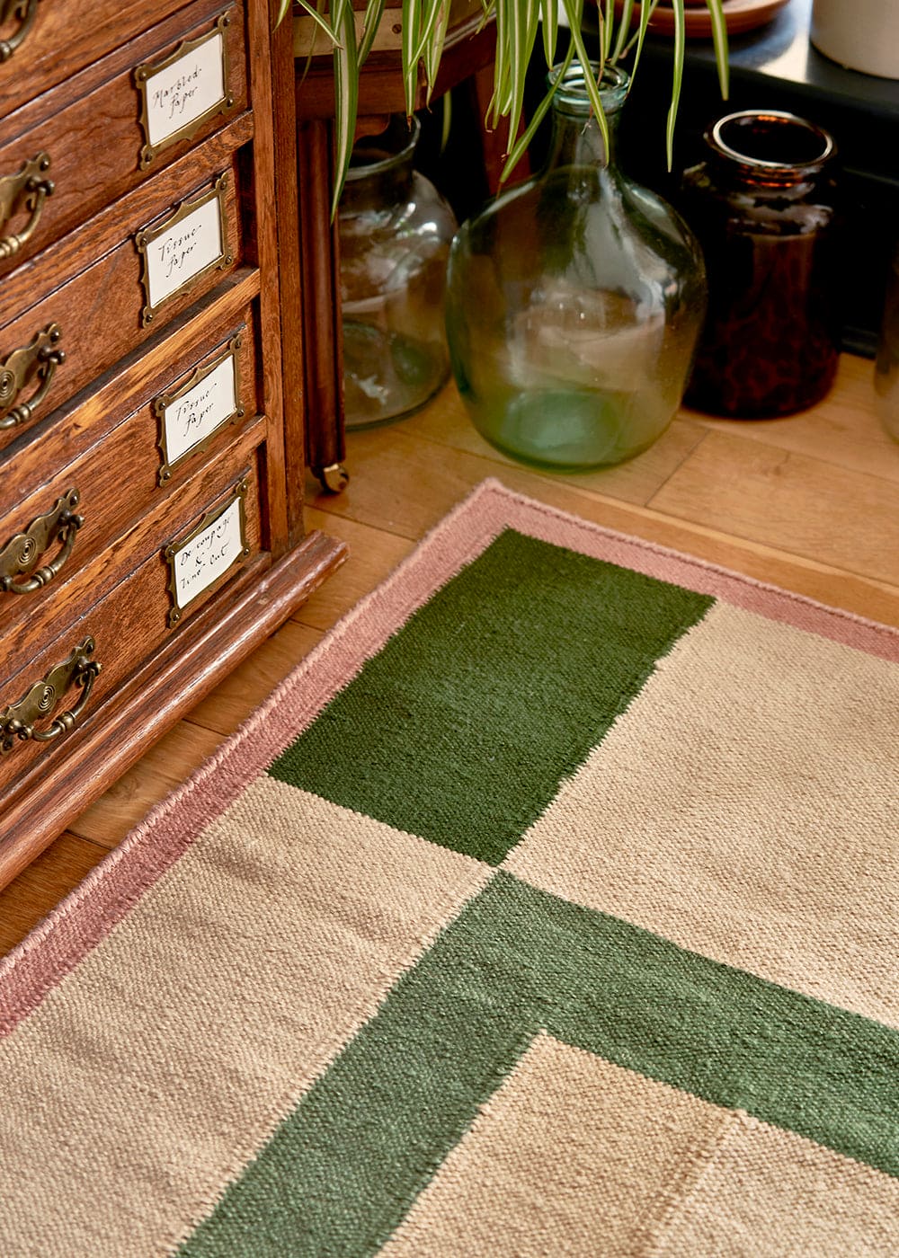 On horizontal looms, artisans pass the weft yarns carefully through the warp, beating them tightly into place to form a strong, flat surface to create a tactile, versatile flatweave.