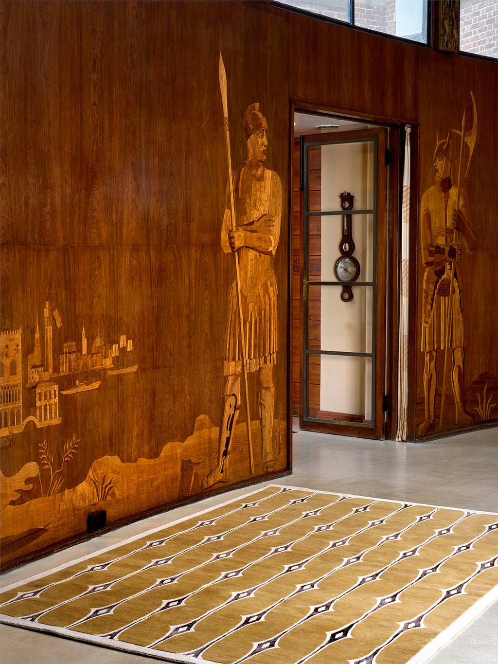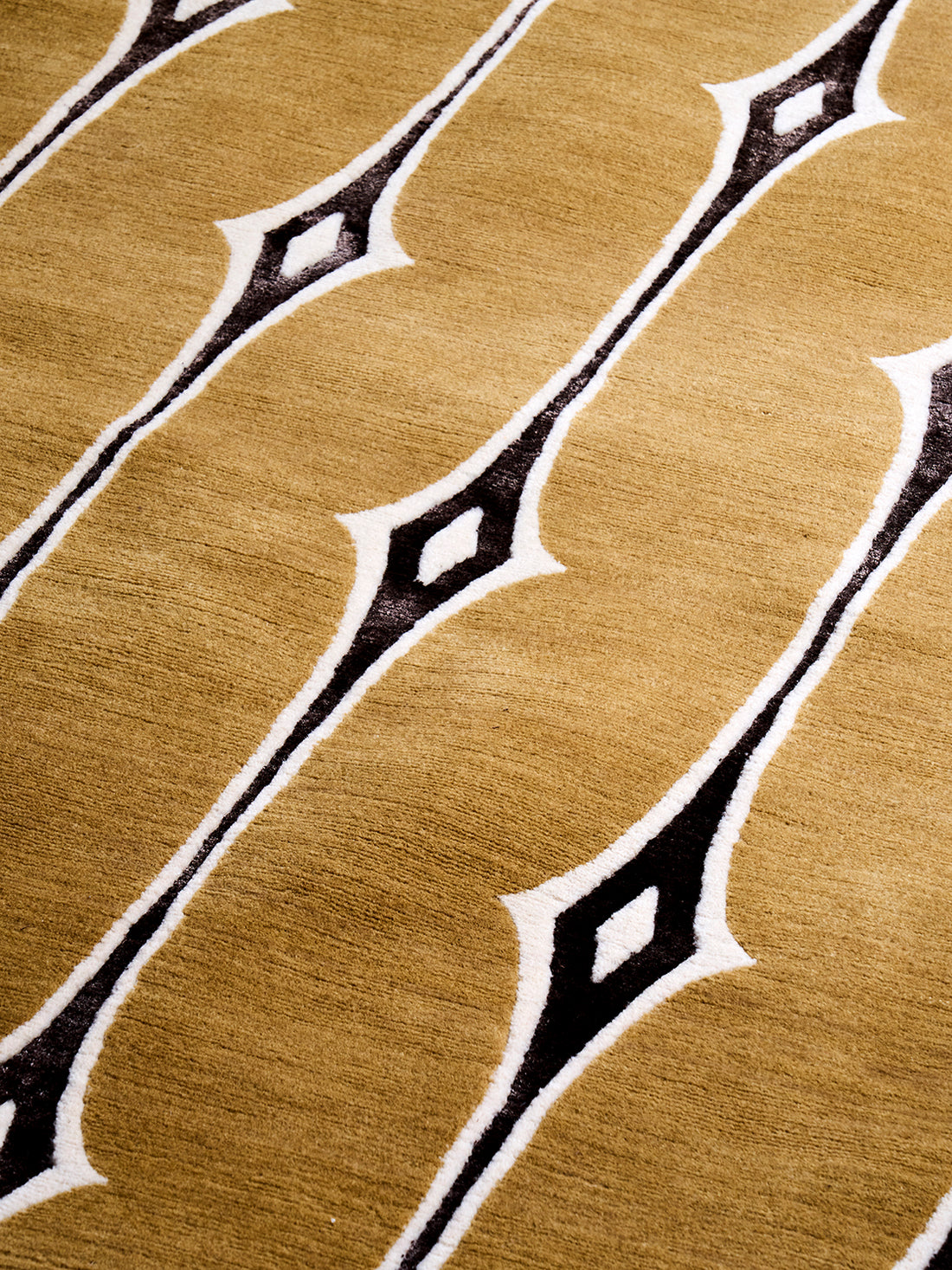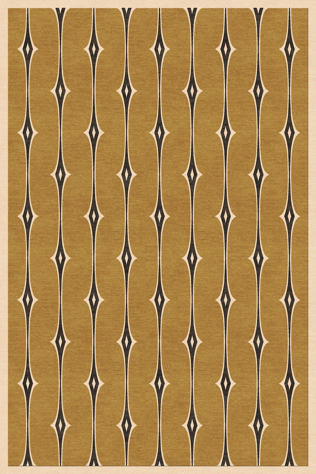 One of our most immersive Art Deco rugs, Sedra fills the floor with rhythm and movement. Vertical columns of sinuous, hourglass-shaped forms repeat across a field of warm gold, creating a hypnotic all-over pattern that feels both bold and refined.